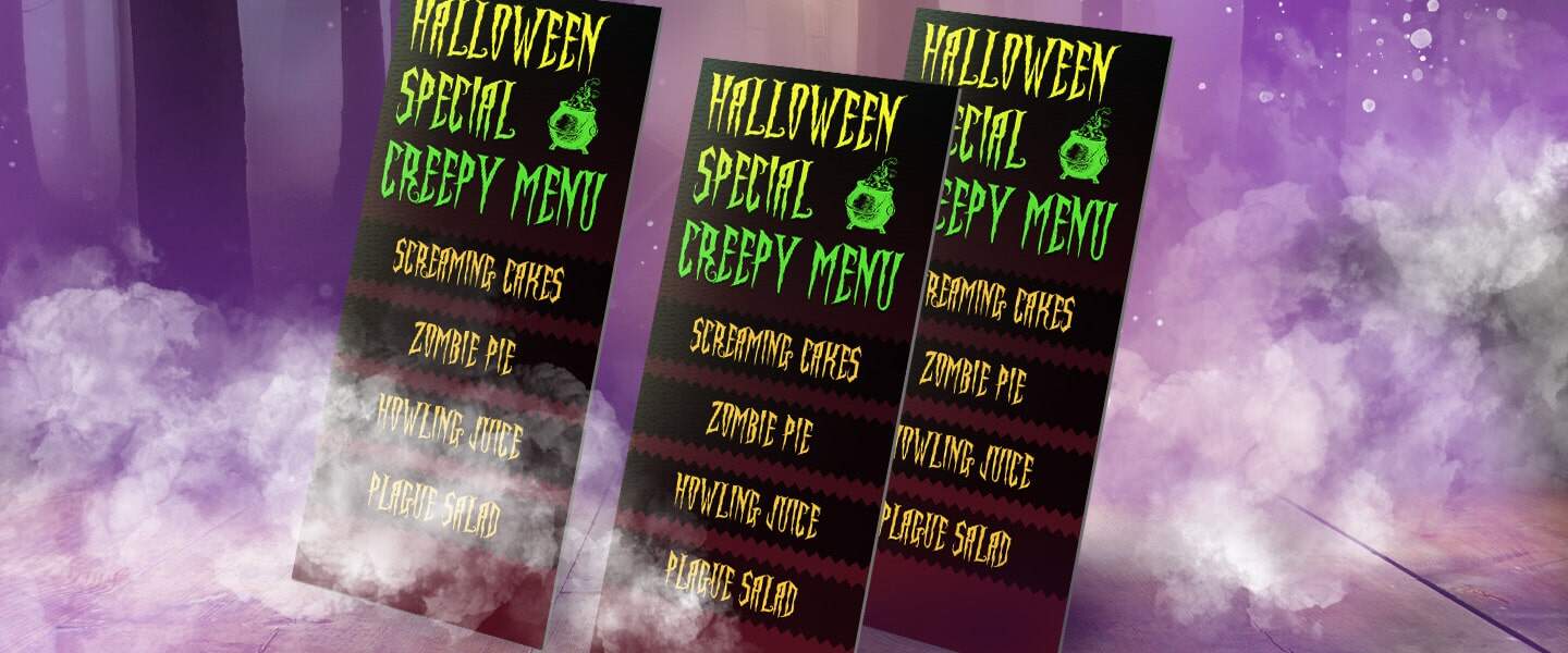 Clever copy makes it fun: “Brewed Potions Served Daily” or “Wickedly Sweet Treats.” Mini menus that double as take-home loyalty cards are also a clever way to stay in your customers’ wallets and minds.